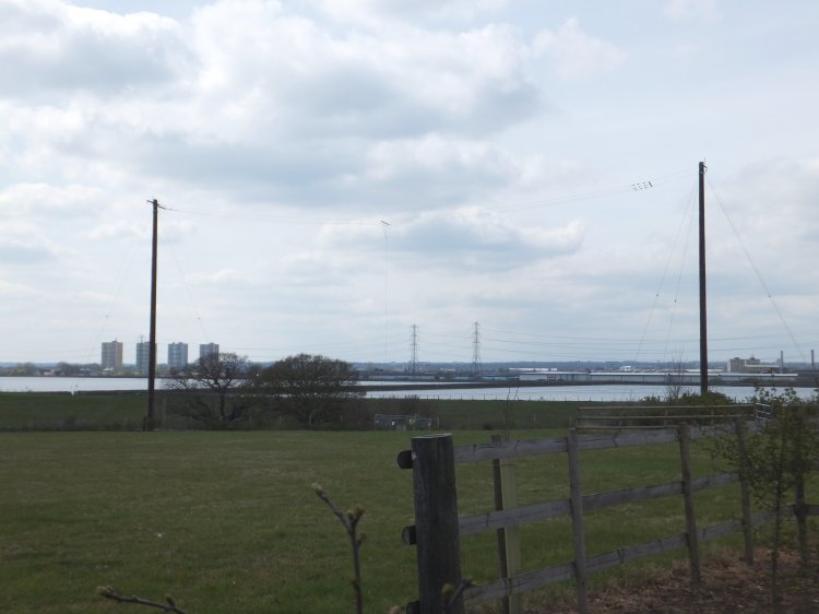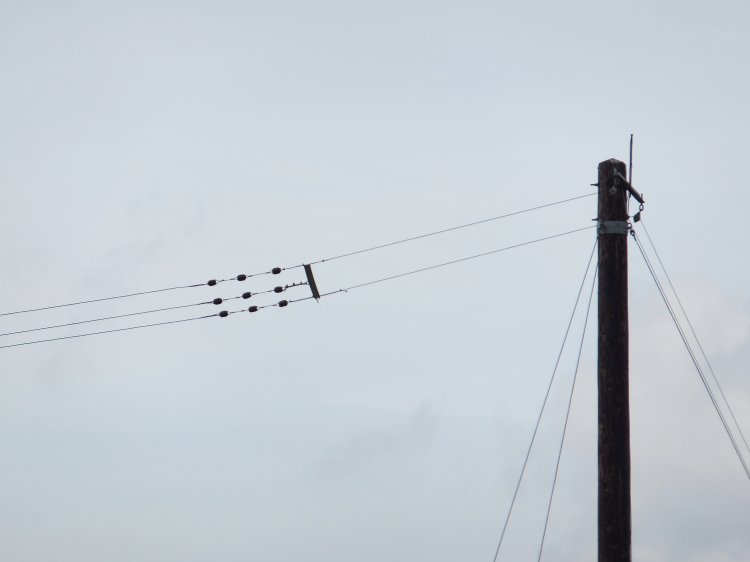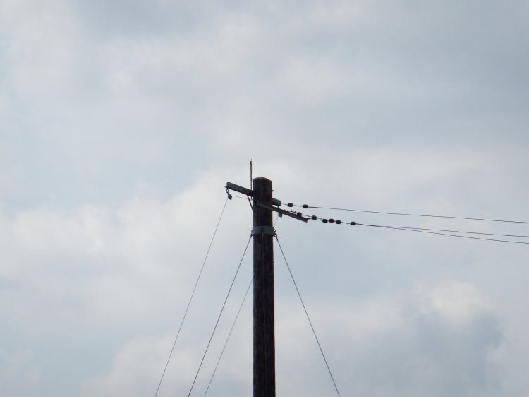 | The T-antenna is now supported by more substantial wooden poles. Research after my visit shows this was the result of discussion between the station, its transmission supplier, and the local planning department. The eventual result, late in 2006, was to approve the replacement of the original "temporary" installation with the wooden poles. An alternative application for a 38m guyed mast radiator was refused. |
