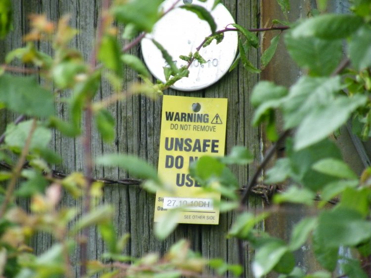 | Seems the plan is to remove all three poles, and replace with a steel structure, overdue, as the photo of this notice was taken late June 2012 |