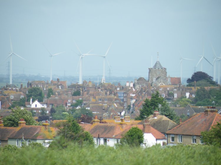| The town of Rye seen from the site. The intended service area is the low part of the town, below the foreground houses. As you can see from the Rx yagis on the buildings, Dover is the Tx of choice, though those windturbines might have caused problems for analogue reception ? |