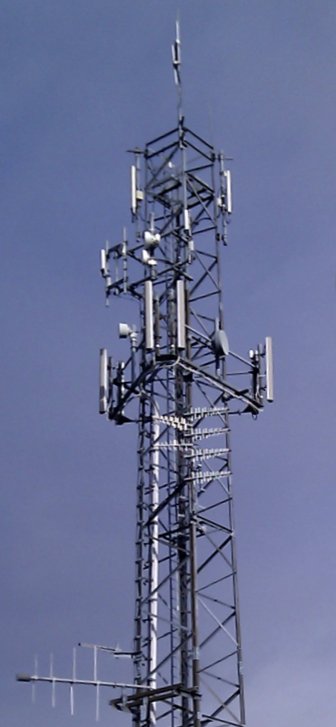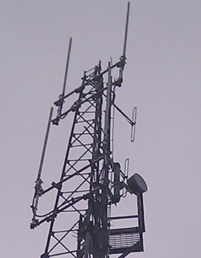 | Close-up of the other mast, carrying various services including local DVB-T and more cell services. |