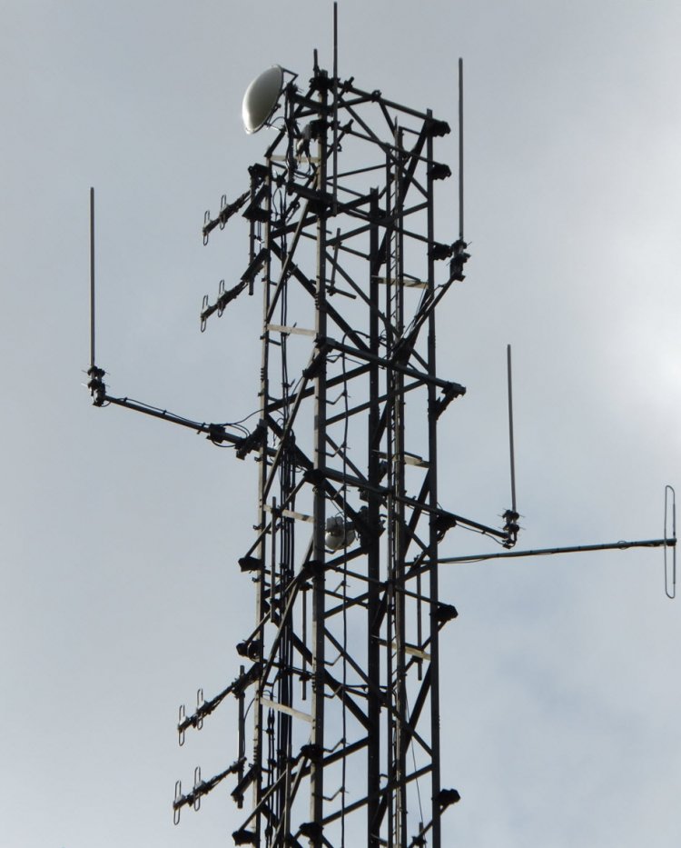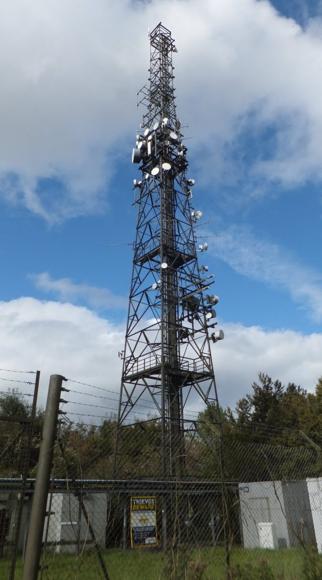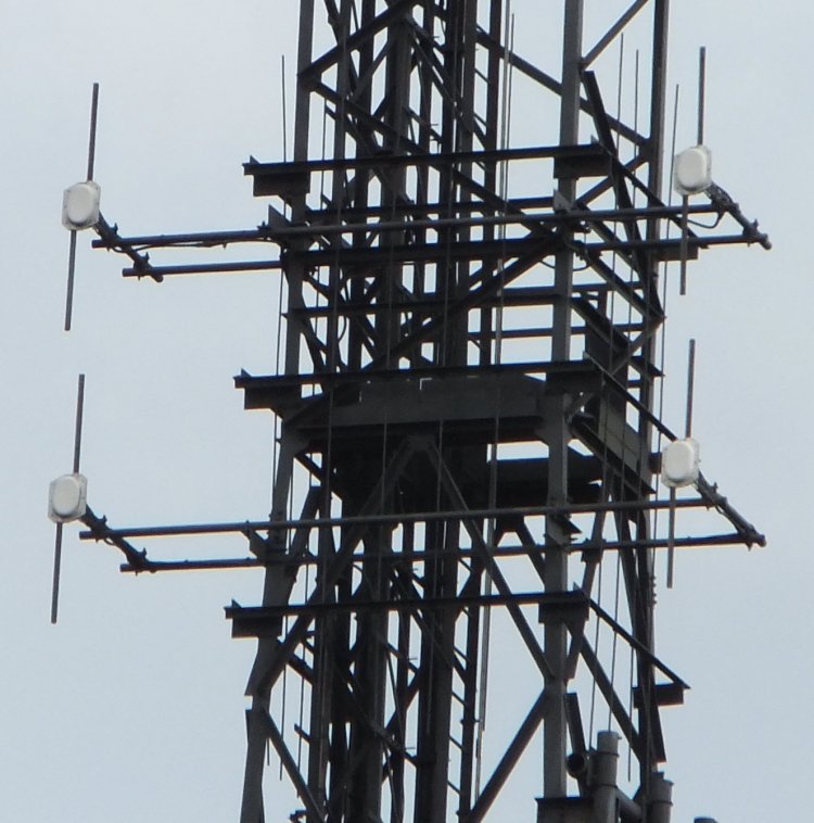 | This is the south tower: DAB comes from two separate arrays, each comprising two pairs of phased dipoles The small SHF dish (behind the large one) facing left, and the one slightly further up, facing right, may form part of the distribution arrangements - see below |