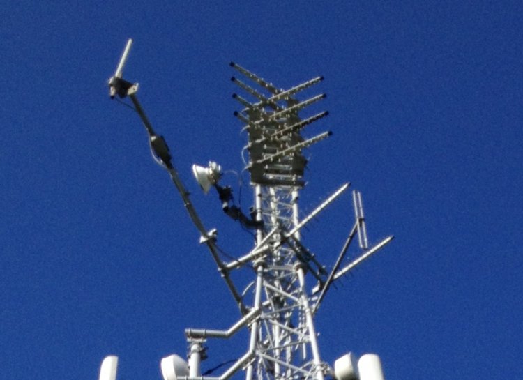 The dishes seem to provide point-to-point links, with the white vertical panel probably being the broadcast antenna. There is probably an array of a dipoles within the panel, which will have a cardiod radiation pattern or similar. |