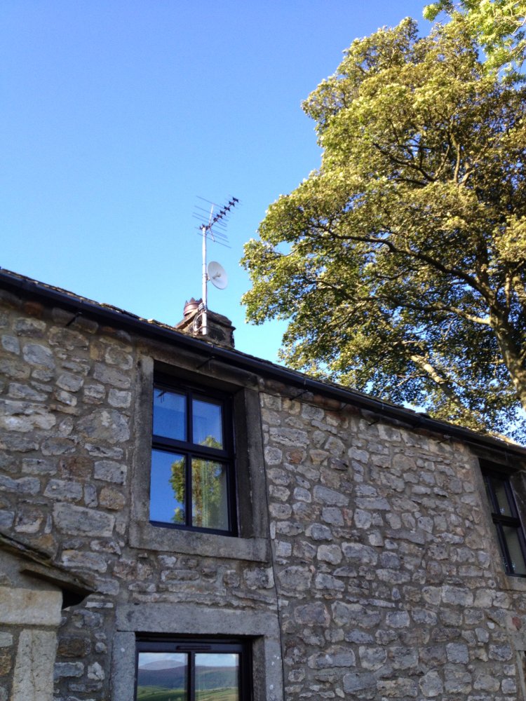The guest house in which we were staying. Wireless broadband receive dish on the chimney. The house was high up in the valley to the north west of Hebden, only a few hundred metres from Grassington UHF and afforded great views over Wharfedale to the south east and Hebden Beck valley to the east |