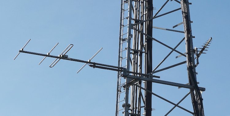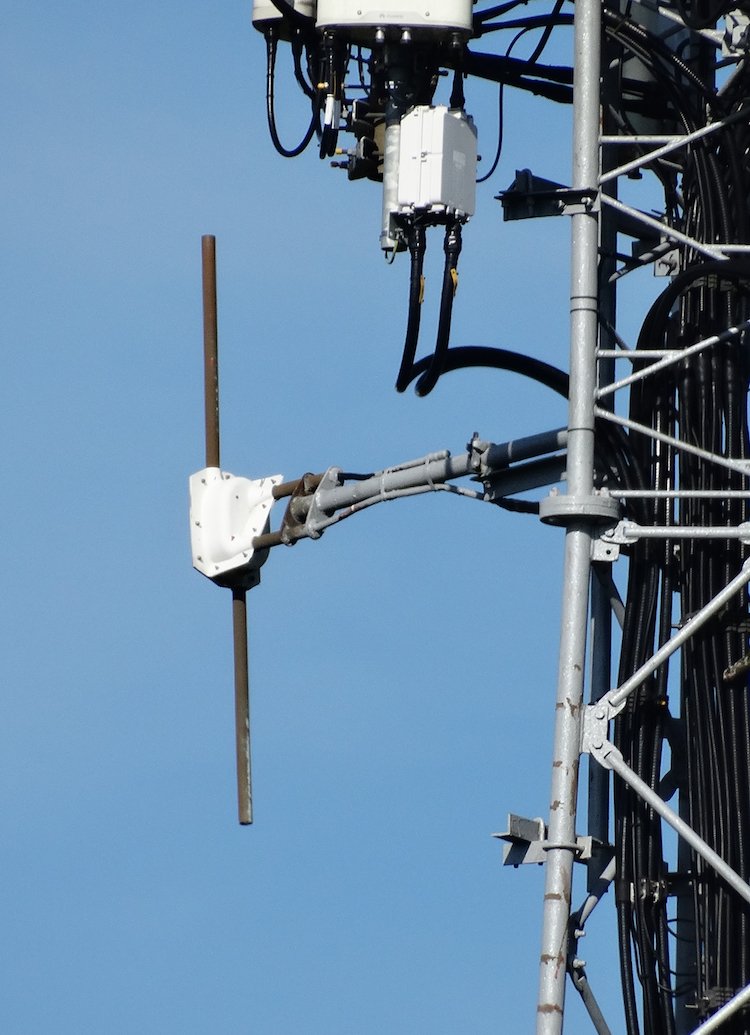 | The top half of the tower with the band II transmit dipole on the left. |