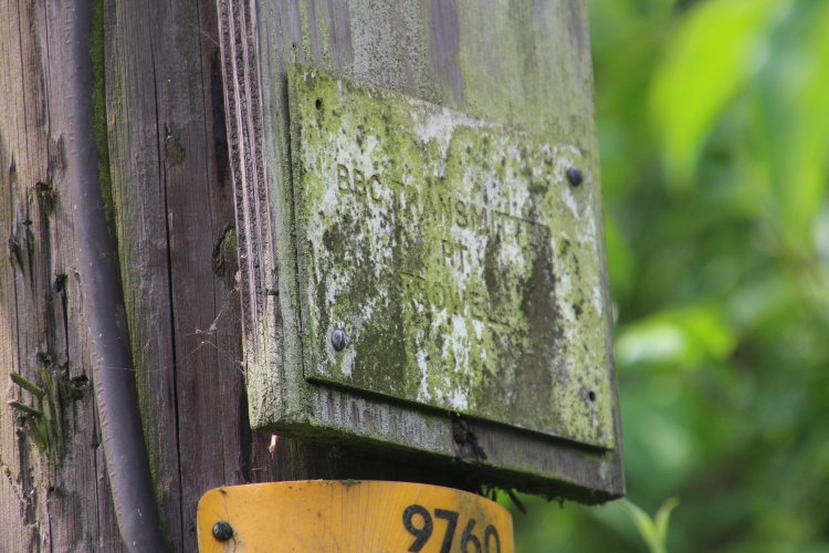 Although very grubby, this is a piece of history. This is the electricity board's identification plate on their transformer pole. The BBC ceased transmitting from this site in 1992 as the medium wave transmitter was required for Virgin radio. |