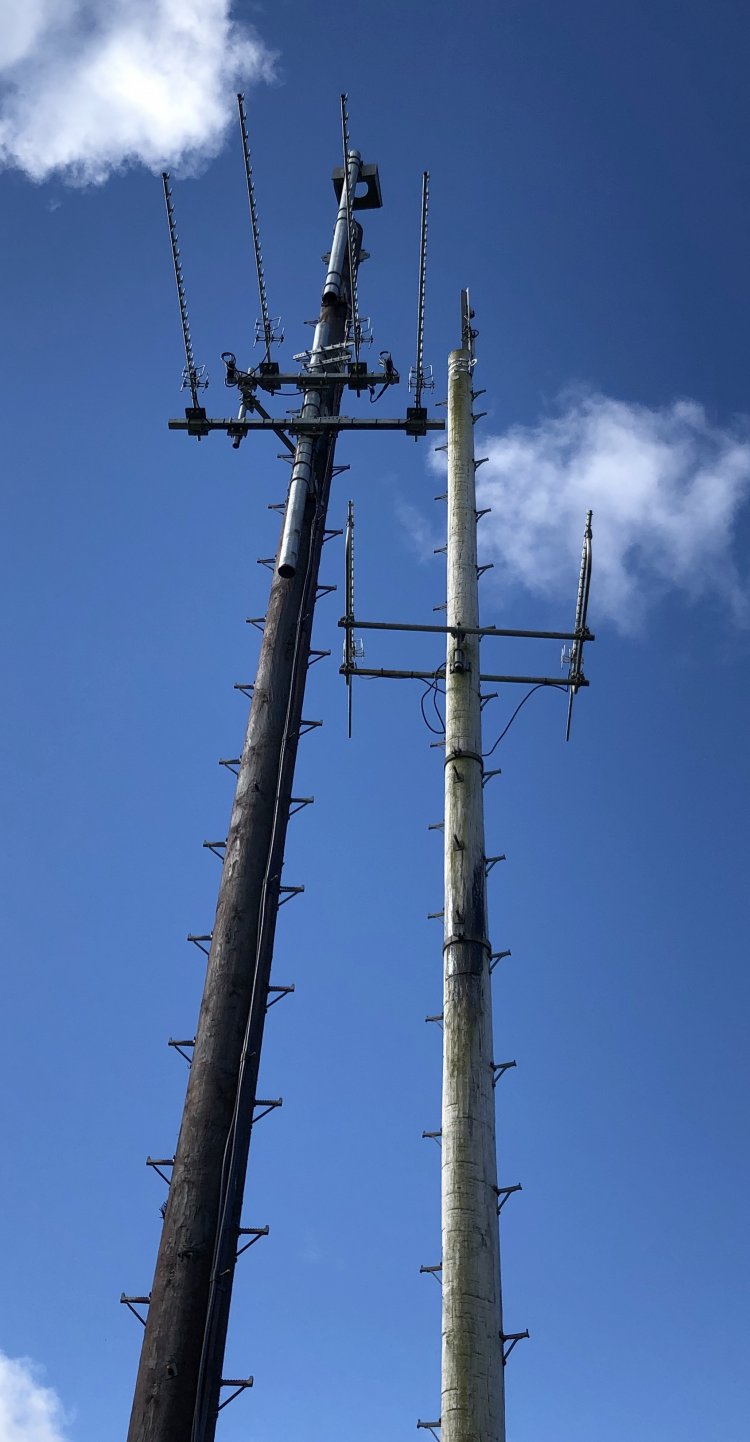 | Old (left) and new (right), poles. Note the steelwork awaiting the new Tx antenna. [Ed]. This new transmit antenna steelwork looks as if a cylinder is to be fitted, as we have seen elsewhere. |