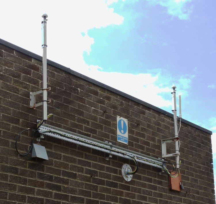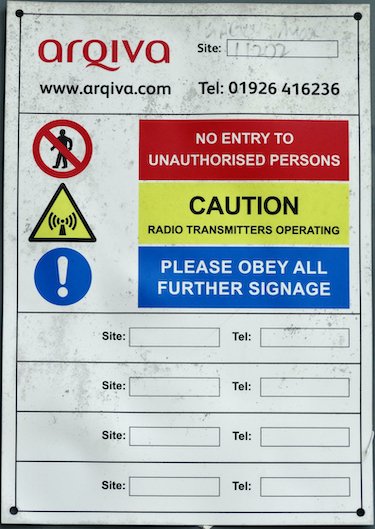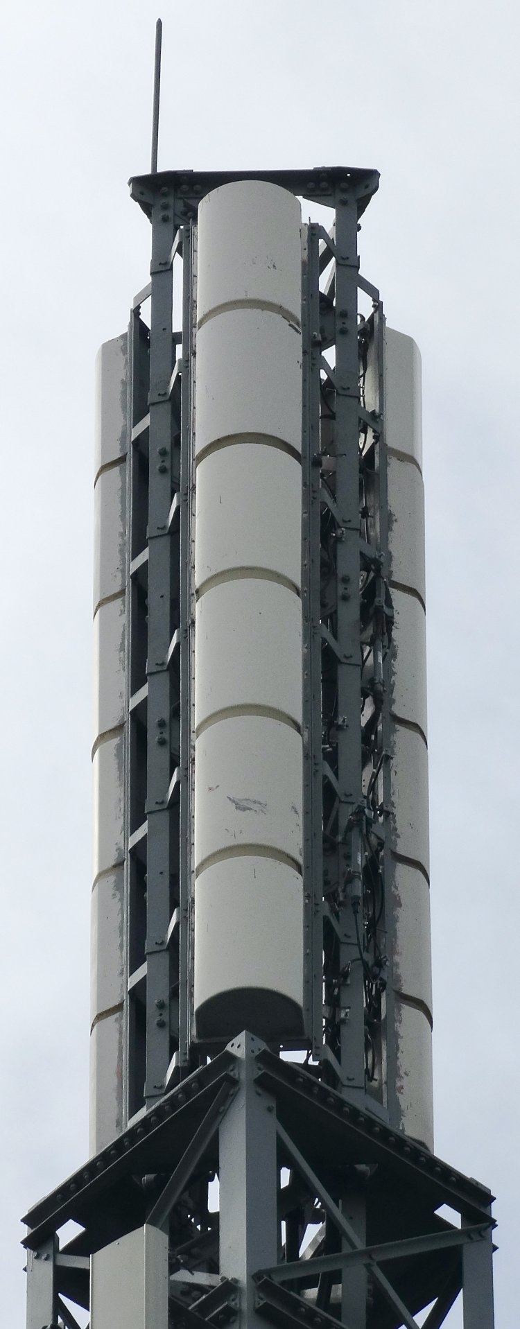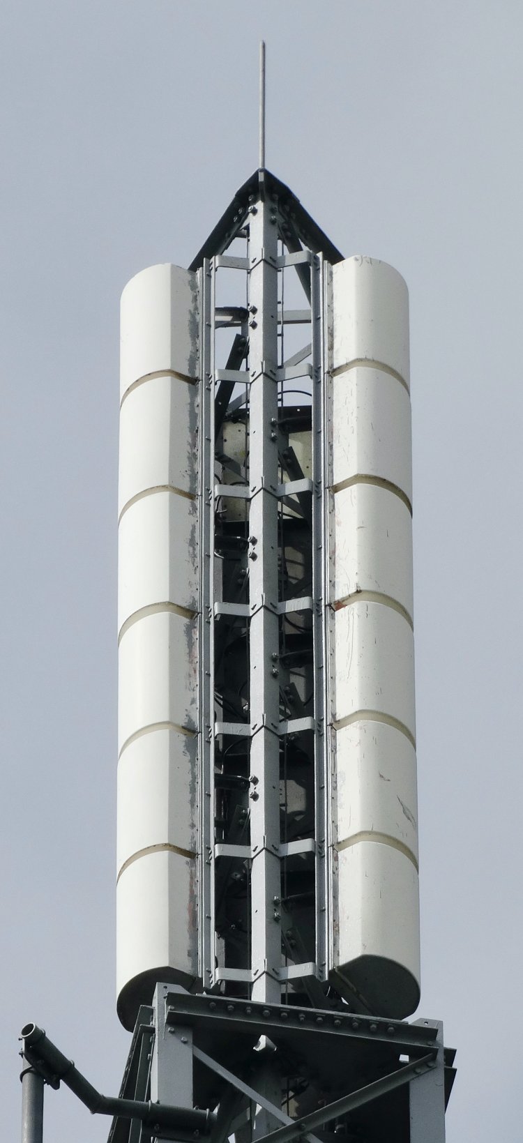 | The UHF transmit panel aerials. These have not had to be replaced for 700 MHz band clearance, as they were designed to cover all the frequencies in band V. Also of note is that this is a three sided array of panels. See the next picture. |