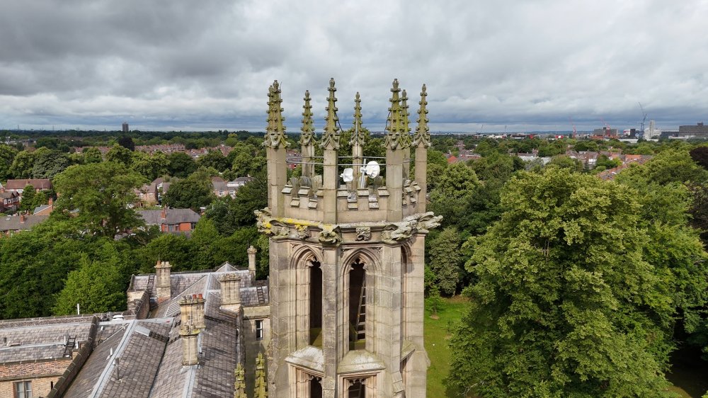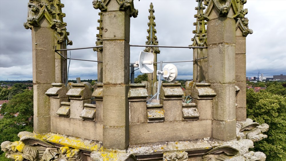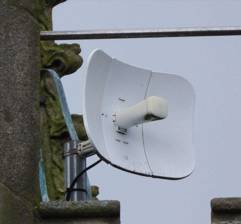 | I had a look around the rooftop looking for evidence of a studio to transmitter link and after a while, and almost giving up, I found it. It’s a microwave link that looks like a Ubiquiti LiteBeam 5GHz link in the turret of this tower that looks out towards the transmitter site at Duffield Court. |