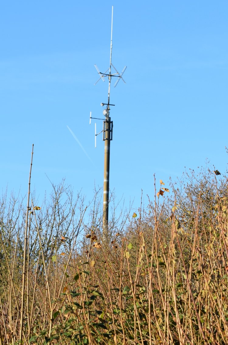 Since my previous visit in November 2024, the Lindenblad array for the 97.5 MHz FM transmission has been raised in height by up to a metre, and there is a new end fed dipole at the very top - possibly a reserve antenna for the FM transmission?