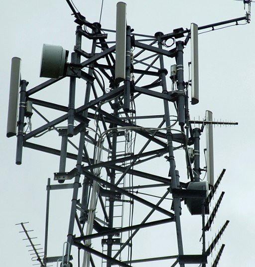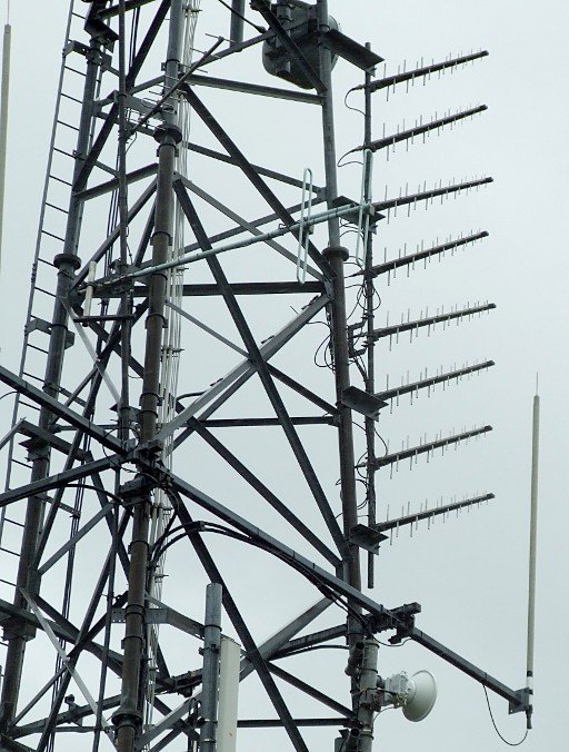 | Taken from the passenger seat of a car in heavy rain. The tower is close to the road. The wooden pole has now gone and the broadcast aerials are now on the tower. The eight stacked vertical log periodic transmit aerials point across the Sound of Mull towards Salen on Mull. A single vertical log periodic is used to receive Torosay. |