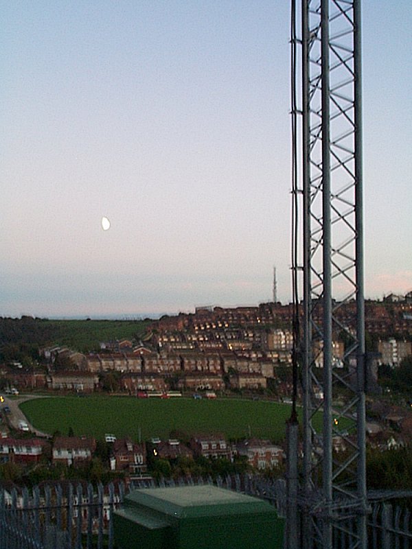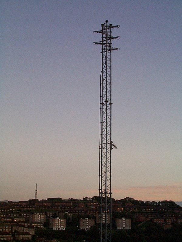 | Bevendean was a BBC landlord site which entered service in 1993 with the channel allocation 51/55/48/29. This was changed 40/46/43/29 as a consequence of interim DTT at Whitehawk Hill. Tony took these shots of Bevendean in the failing evening light of Autumn 2004. The tower in the background at TQ336059 is apparently something to do with the Home Office. |