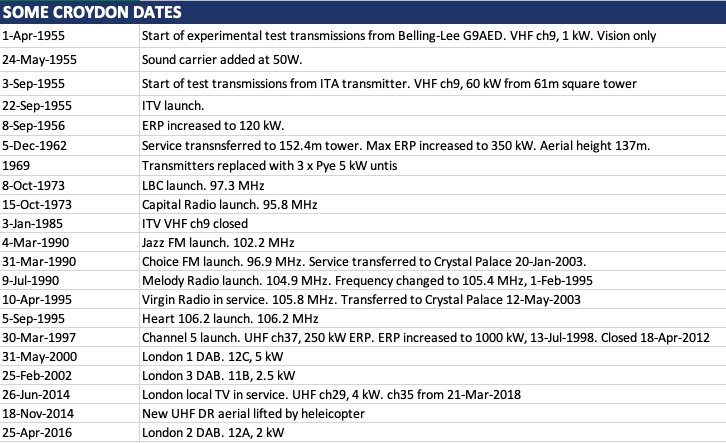 Croydon was the site chosen by the ITA to transmit the London ITV service which launched on 22-Sep-1955 on VHF ch9. Test transmissions commenced on 1-Apr-1955 from a Belling-Lee experimental low power transmitter with the call sign G9AED. The ERP quoted was just 1 kW and initially there was no audio carrier transmitted. The ITA transmitter started test transmissions on 3-Sep-1955. Initially a 61m (200ft) tower with an omni directional band III aerial transmitted the service with an ERP of 60 kW. The ERP was increased to 120 kW from 8-Sep-1956. The permanent 152m (500ft) tower was constructed during 1962 on the site of a former tennis court. It took over the London ITV transmissions on 5-Dec-1962. |