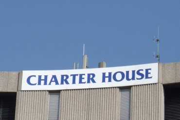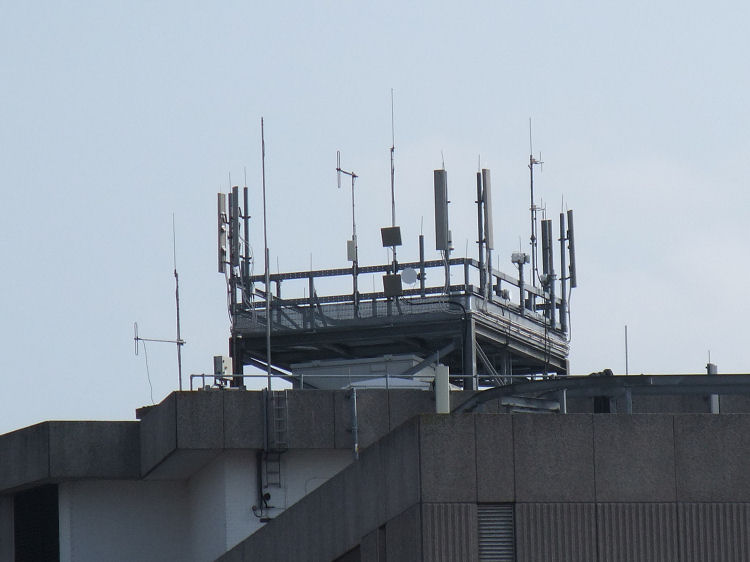 | Needed a bit of detective work on this one... From the adjacent multi-storey car park I could see various dipoles and end-fed antennas, but also "something odd". I went round the front for another look. Cross-checking with planning applications confirms that the broadcast antenna here is indeed a Shively Labs 6812 2-bay circular polarisation antenna. |