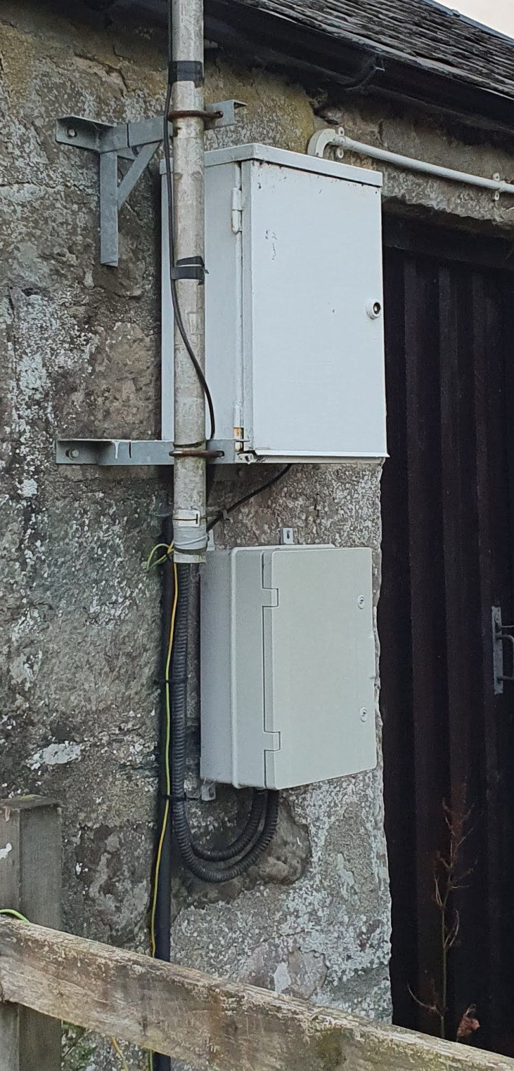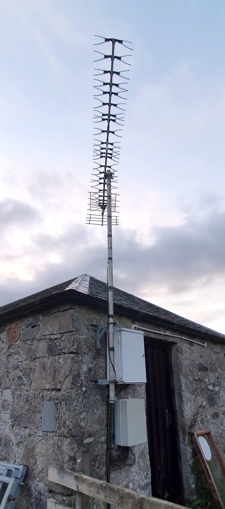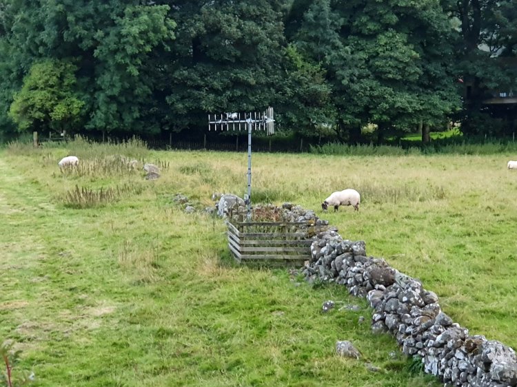 | A close up of the self help enclosures. The Ofcom data sheet from 2006 lists this as an analogue active deflector of the Callander frequencies. Given the fields worth of distance between the receive and transmit antenna this still seems to be the case, only changing to a digital active deflector at DSO. If I find the time to reception test this in future though I will find out for definite. [Ed]. Callander Holiday Park was one of 26 self-help relays to convert to a digital licence at DSO. It remains an active deflector of Callander. The black cable leading directly down seems to be the feed from the receive antenna pictured at the beginning. Judging by the minimal rust present on the enclosures I assume they were upgraded at DSO. I'll try and post an update when I'm next in Callander of how reception from this setup fairs up at the Holiday Park. It seems capable of transmitting a good signal and looking on google maps, all of the roadside caravans with TV aerials are pointing towards this one so it's definitely welcomed at the park. |
