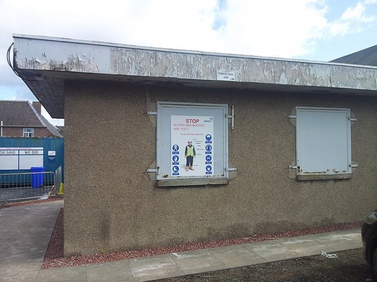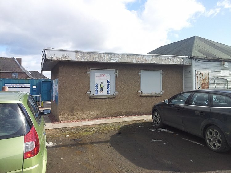 This building is the only plausible remnants of a "transmitter hall" that can be found at the site listed in the BBC 1978 transmitter booklet (NGR NT227761, address : Crewe Road Gardens, Edinburgh). There are no other signs of any historic transmitter operations at this site, which is now a builder's yard in a built-up urban area of 1930s-style housing. Photo taken Wednesday, 13 March 2013.