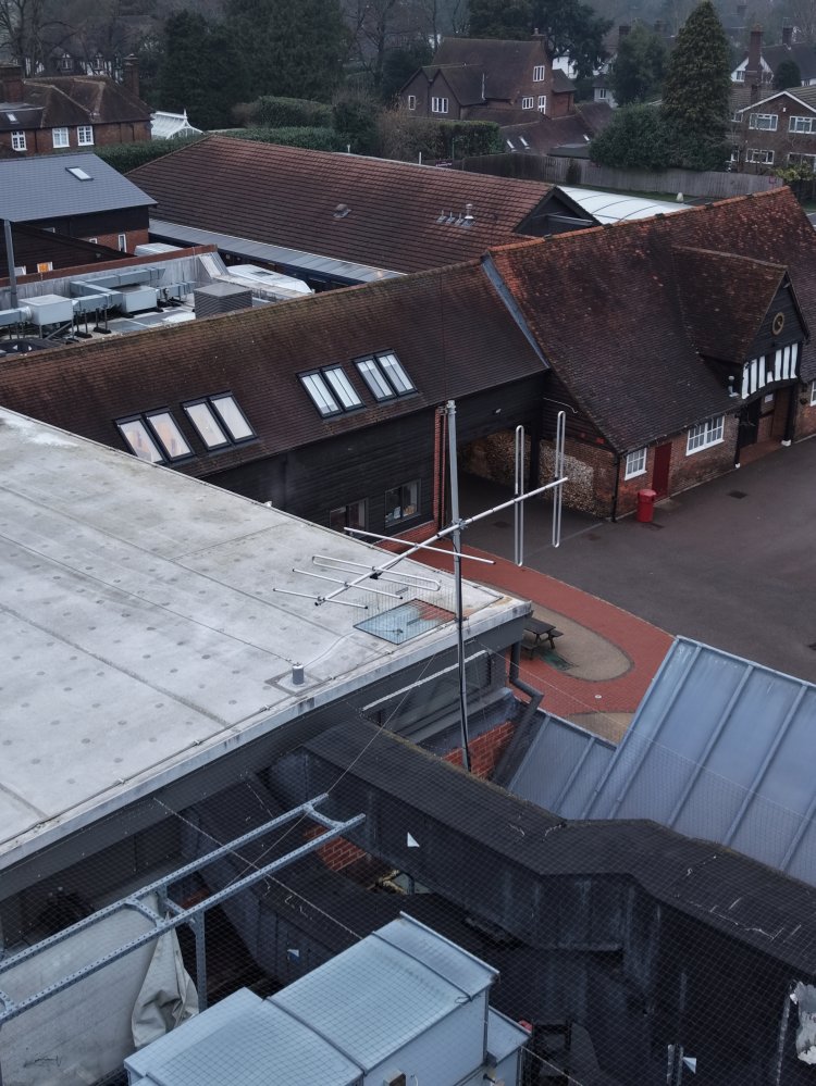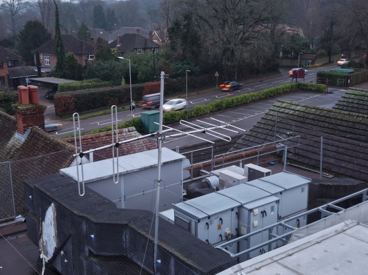 | An unusual transmit aerial arrangement here. The two vertical folded band II dipoles form a typical cardioid array, which according to Ofcom Tx Parameters is facing south, while the horizontal four element Yagi faces in the opposite direction - north. Also confirmed by Tx Parameters. Both polarisations radiate with a maximum ERP of 50 Watts. |