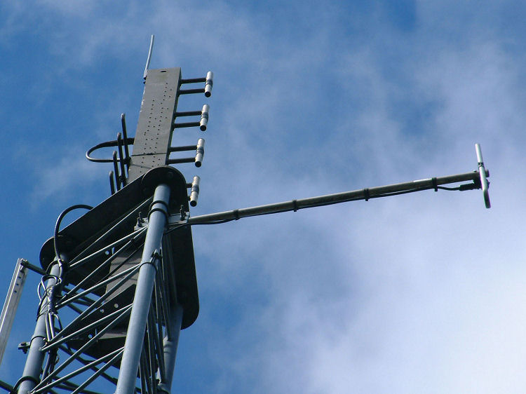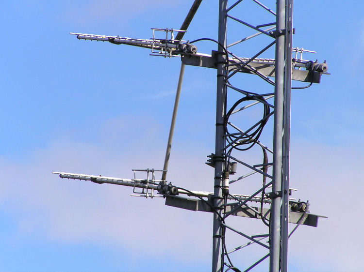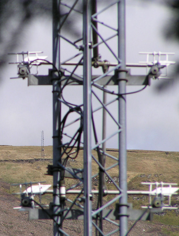 | This shot taken from behind the Rx array, with the link Tx in the distance, seems to show the yagis pointing somewhere to the right of the link Tx. Of course the actual angular discrepancy is exaggerated by the camera, and it is really very small - much too small to matter if only one yagi had been used. But with yagis this far apart and phased together gain would be greatly reduced in the direction of the link. That's assuming that the feeders to each yagi are exactly the same length. And it's also assuming that the aerials are precisely 'side by side'. And maybe the link's transmit aerial is actually some distance from the tower, to prevent feedback, and the receive array in the village is in fact pointing at it with great exactitude... Here's another minor puzzle. How come the receive array seems to have been bolted to the tower so that it's exactly square onto two of the legs? The left hand aerials are exactly the same distance forwards as the right hand ones, suggesting that no phasing adjustment was necessary to maximise gain. Coincidence or good planning? Of course, the four receive aerials might not be connected together in phase at all. Maybe the top two or the bottom two provide back up. Or maybe the left hand pair is stacked in order to reduce pick up from the transmit aerials and the car park below, with right hand pair providing back up. Or maybe it's the other way round. Maybe the Holy Grail is in a safe deposit box at Paddington Station and Osama bin Laden is driving a taxi in Bradford. In any case the Strathyre receive array must struggle to provide a clean signal given the very low field strength provided by the measly 0.5W link transmitter. Since it's mounted not very far above the junior school car park I wonder if the whole village suffers impulse interference on school open nights! If only my old legs had been willing to carry me up the mountain I could have provided answers to some of these questions. In the absence of enthusiastic legs all I can offer is this wild speculation. Better information is needed here. Anyone? |