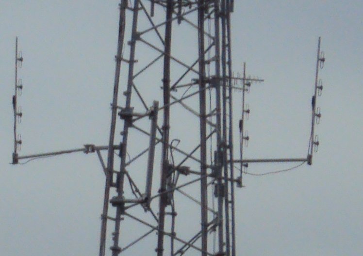 | A stack of dipoles at the top for UHF transmission, with Band II from the three panels lower down. The two slant-polarised yagis receive Wenvoe |