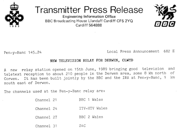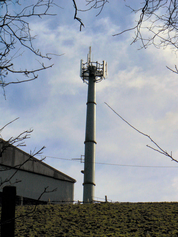 | Located just off the A494 between Corwen and Ruthin. The mast is a shared services site located at the rear of a farm in Pen-Y-Banc, outside the village of Bryn Saith Marchog. The original structure was a 14m wooden pole which was replaced for site sharing with this steel monopole. |