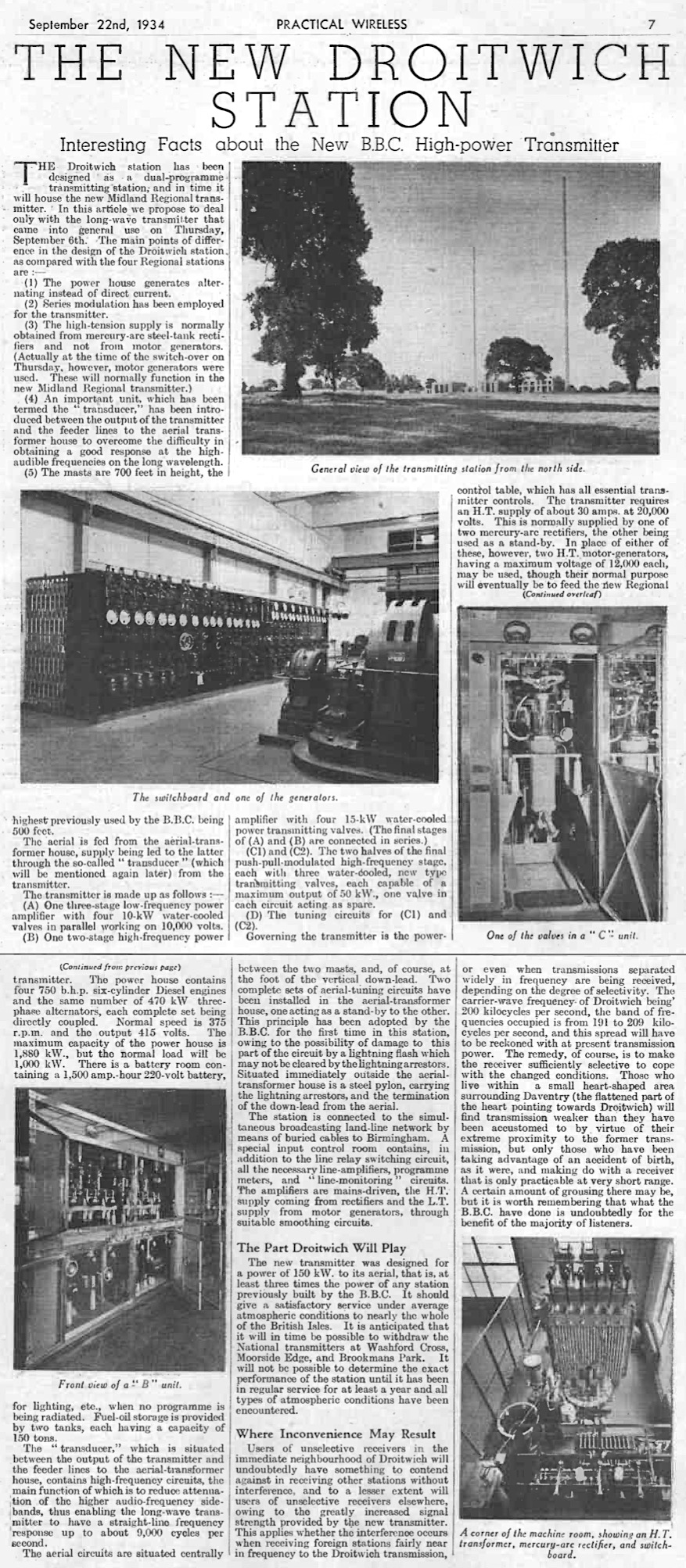 | Cutting from NewsLink Feb/March 1988. (MCSL journal). History of services transmitted from Droitwich Droitwich was the fifth transmitter site opened as part of the BBC's regional scheme, replacing both the long wave 5XX, and medium wave 5GB transmitters at Daventry. 7-Oct-1934. National Programme entered service on 200 kHz at 150 kW. 17-Feb-1935. Midland regional programme entered service on 1013 kHz at 50 kW. 1-Sep-1939. National programme on long wave closed and the medium wave transmitter re-tuned to 767 kHz, and carried the Home service (Northern group). Early 1940. 2 kW transmitter brought into use for the Forces programme on 877 kHz. Later replaced by 20 kW unit. 20-Oct-1941. New 400 kW transmitter entered service carrying the European service on 1149 kHz. 16-Nov-1941. Long wave transmitter brought back into use carrying European service on 200 kHz. 1943. 300ft Blaw Knox tower erected. Used for European service on 1149 kHz from 19-Dec-1943. 29-Jul-1945 the BBC resumed peacetime operation with the new Light programme on 200 kHz long wave and the Midland Home service on 1013 kHz. 29-Sep-1946 the Third programme entered service on 583 kHz at 25 kW. 15-Mar-1950, Copenhagen plan frequency changes implemented. Midland Home service changed to 1088 kHz. Long wave transmitter power increased to 400 kW. Third programme closed. Service transferred to Daventry. 25-Jun-1950, Midland Home service transmitter power increased to 150 kW. 8-May-1961 Midland Home service transmitter replaced by units recovered from the wartime station at Ottringham. 18-Sep-1962. Long wave transmitter also replaced by units recovered from Ottringham. 30-Sep-1967. The Home service reserve transmitter brought into use for the start of Radio 1 on 1214 kHz at 30 kW. 2-Sep-1972. Plan to de-regionalise Radio 4 in England, releasing frequencies for local radio, come into effect. Radio 4 frequency changed from 1088 kHz to 1052 kHz. 8-Feb-1976. New replacement transmitter entered service for Radio 1 on 1214 kHz. BBC Doherty 50 kW unit. 23-Nov-1978. GE75 frequency changes implemented. Radio 4 transferred onto 200 kHz long wave, Radio 1 transferred onto 1053 kHz, (was 1052 kHz) Radio 3 onto 1215 kHz, (was 1214 kHz). New transmitter brought into use on 693 kHz for Radio 2. 3 x Marconi B6034, 50 kW units. 17-Dec-1979 Long Wave Tee antenna blown down during a gale. 3-Nov-1981. New replacement transmitter entered service for Radio 1 on 1053 kHz. 3 x Marconi B6034 units. 1983 - 1985 Masts C & D constructed, replacing the Blaw Knox tower. Then used for Radio 1 & Radio 3 on 1053 & 1215 kHz. June 1987. A new replacement 500 kW long wave transmitter was brought into use. 2 x Marconi B6042, 250 kW units. 1-Feb-1988. Long wave frequency changed to 198 kHz. 27-Aug-1990. Radio 5 replaces Radio 2 on 693 kHz. 28-Feb-1992 Radio 3 on 1215 kHz closed. 30-Apr-1993. INR 2 (Virgin Radio), launches on 1215 kHz. 30-Jun-1994 Radio 1 closes on 1053 kHz. 14-Feb-1995. INR 3 (Talk Radio), launches on 1053 kHz. 20-Jan-2023 INR 2 (Absolute Radio) 1215 kHz closed. |